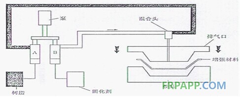 將兩種或兩種以上的組分在混合區低壓(0.5MPa)混合后,即在低壓(0.5-1.5MPa)下注射到閉模中反應成型,此即為工藝過程。若組分一為多元醇,一為異氰酸酯,則反應生成聚氨酯 。為增加強度,可直接在一種組分內行加入磨碎玻纖原絲和(或)填料。亦可采用長纖維(如連續纖維氈、織物、復合氈、短切原絲等的預成型物等)增強,在注射前將長纖維增強材料預先置模具內。用此法可得到高力學性能的制品。