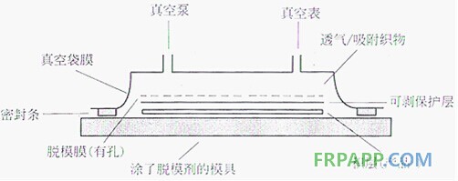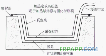 此法是手糊法與噴射法的延伸。將手糊或噴射好的積層在樹脂的A階段與模具在一 起,在積層上覆以橡膠袋,周邊密封,在后用真空泵抽真空,使積層受到不大于1個氣壓的壓力,而被壓實、固化、成型。