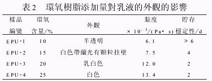 表1 說明隨著環氧樹脂添加量的增大,乳液膠膜硬度增大,附著力級數提高,拉伸強度增大,斷裂伸長率下降。因為隨著環氧樹脂添加量增大,一方面改性水性