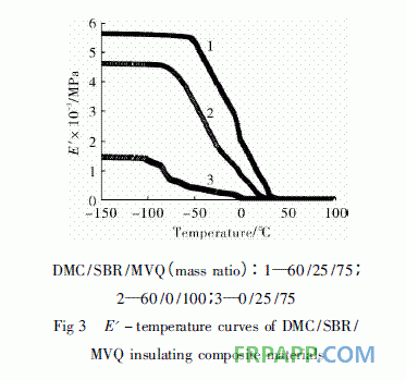 由圖3 可以看出,在相同溫度下,質量比為60 /25 /75 的DMC /SBR/MVQ 絕緣復合材料的儲能模量( E’) 最高,質量比為60 /0 /100 材料的E’次之,質量比為0 /25 /75 材料的E’最低。其原因可以解釋為E’是材料剛性的表征,DMC 的剛性比橡膠的大( 不論是玻璃態還是高彈態) ,因此含DMC 的絕緣復合材料的E’始終高于同溫度下不含DMC 的材料。另外,由于MVQ 比SBR 柔軟,所以質量比為60 /25 /75 的DMC /SBR/MVQ 材料的E’高于質量比為60 /0 /100 材料的E’。此外,DMC 中玻璃纖維均勻分散在SBR/MVQ 的并用膠中,起到骨架作用,而DMC 中少量的不飽和聚酯能夠與SBR/MVQ 并用膠交聯,形成大量交聯點,由此可知DMC 的加入能夠限制SBR/MVQ 并用膠分子鏈段的運動,使材料的E’增大。