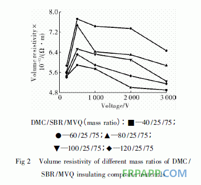 為了防止材料在使用過程中發生漏電或擊穿現象,作為絕緣復合材料必須具有優異的電絕緣性能。本實驗用體積電阻率來表征復合材料的電絕緣性能。由于DMC 具有良好的電絕緣性能,它的加入提高了絕緣復合材料的電絕緣性能; 同時,白炭黑本身是無機固體顆粒,其引入也對絕緣材料的電絕緣性能起到一定的增強作用。本實驗考察了不同DMC 用量對復合材料體積電阻率的影響。由圖2 可以看出,隨著電壓的增大,不同試樣的體積電阻率都表現出先增大后減小的趨勢。所有試樣的體積電阻率都在4. 8 × 1012 Ω·m 以上,其中,DMC /SBR/MVQ( 質量比) 為60 /25 /75 的絕緣復合材料的體積電阻率最高,說明其絕緣性能最好。相比較而言,DMC 含量過少不能很好地起到絕緣作用,而加入量過大,則在復合材料中不能均勻分散而產生堆積,造成復合材料的電絕緣性能下降。