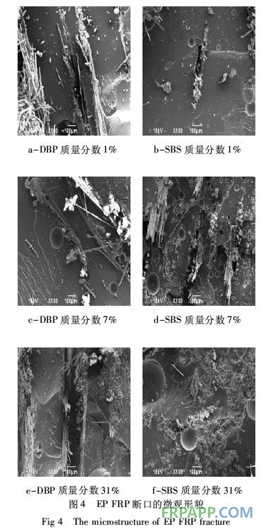 圖5為增韌劑質量分數為7%時的EP FRP斷口微觀形貌圖。從圖中不難看出,DBP增韌的EP FRP基體具有韌性特征,DBP用量的增加會有利于EPFRP性能的改善;而SBS增韌的EP FRP只是在基體內部存在一些SBS彈性聚集體,隨著SBS用量的增加,SBS會形成更大的相疇,就會使SBS自身強度差的特性顯現出來,從而降低EP FRP的強度。