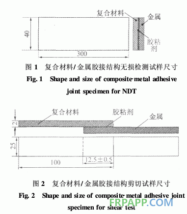 試驗材料為T700碳纖維/環氧樹脂基和T300碳纖維/環氧樹脂基預浸帶制成的復合材料試板,其中兩種碳纖維的體積分數名義值均為60%。分別按ASTMD3039,ASTMD6641,ASTMD790,ASTMD2344,ASTMD3518和ASTMD1002-2005的要求加工出縱向和橫向拉伸試樣、縱向和橫向壓縮試樣、縱橫剪切試樣、彎曲試樣、層間剪切試樣以及復合材料/金屬膠接結構剪切試樣。其中,復合材料/金屬膠接結構無損檢測試樣的幾何形狀及尺寸見圖1,剪切試樣的幾何形狀及尺寸見圖2。