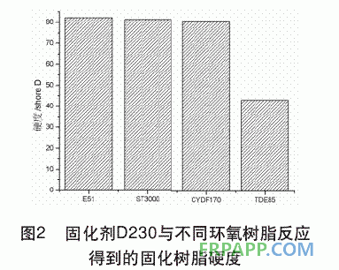 (1)以D230作為固化劑,雙酚型環氧樹脂E51、ST3000、CYDF170由于內聚能大,固化后樹脂硬度可達到80邵D;而混合型環氧樹脂TDE85固化后僅為43邵D。