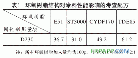 但是,隨著近年來海洋涂料性能標準的不斷提高,要求所用的環氧樹脂在耐熱性、高韌性、耐濕性等方面得到改善,以實現高性能化。然而,由于環氧樹脂分子間作用力大,聚集體呈剛性,加上分子鏈能規整排列,形成高度結晶,在常溫下呈脆性,沖擊性能很差。因此,亟需了解并掌握不同結構的環氧樹脂特點,特別是沖擊性能,這對設計開發海洋船舶用環氧樹脂涂料具有重要的意義。本文通過選用不同結構的環氧樹脂,包括雙酚A型、氫化雙酚A型、雙酚F型和混合型,以柔性聚醚胺作為固化劑,考察涂料的硬度、附著力和沖擊性能,以得到不同環氧樹脂結構與涂料性能的關系,從而為海洋船舶環氧涂料的開發和應用提供理論基礎。
