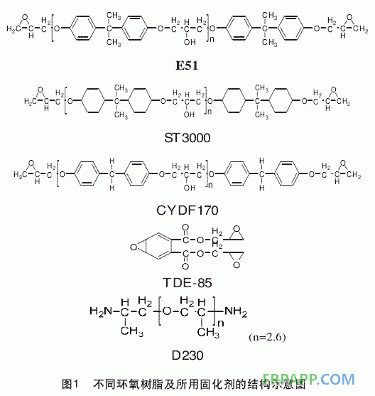 雙酚A環氧樹脂E51:環氧值0.51,南通星辰合成材料有限公司;氫化雙酚A環氧樹脂ST3000:環氧值0.43,上海眾司實業有限公司;雙酚F環氧樹脂CYDF170:環氧值0.60,上海眾司實業有限公司;混合型環氧樹脂TDE85:環氧值0.85,天津晶東;D230:胺活潑氫當量60g/eq,亨斯邁聚氨酯(中國)有限公司;丙酮:國藥集團化學試劑有限公司。所有樹脂及固化劑的化學結構如圖1所示。