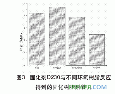 (2) 對于本文所研究的四種環氧樹脂,附著力的大小關系為ST3000>CYDF170 >E51>TDE85,ST3000與D230固化后對拋光鋼板的附著力可達到4.7MPa。