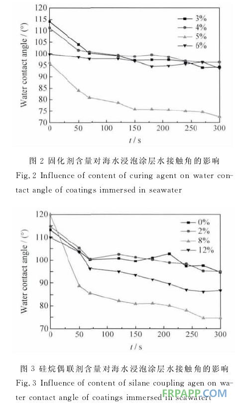 (1)固化劑含量增加,邵氏硬度增加。當固化劑含量4%時,彈性模量最高。固化劑添加5%,去離子水和海水浸泡的吸水率最大;硅烷偶聯劑的含量增加,吸水率隨之增大,彈性模量也有增大的趨勢。而邵氏硬度和水接觸角減小。