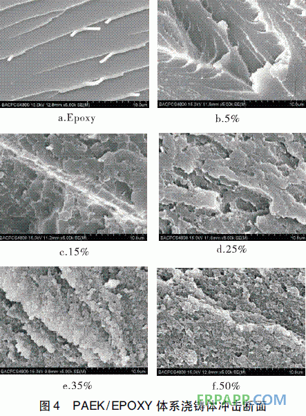 圖4e 與圖4f 顯示,35%、50%體系與25%體系雙連續結構相比,沖擊強度也更高。35%體系與50%體系已初步呈現出相反轉結構,裂紋行進的過程中雖然仍以富EPOXY 相的斷裂耗能以及富PAEK 相的撕裂塑性變形來消耗裂紋擴展能,但此兩種體系富PAEK 相組分所占的比例更多,可能是富PAEK 相的撕裂變形仍主導了富PAEK 相/富EPOXY 相雙連續結構中裂紋擴展能耗的緣故,因此在雙連續相結構體系中,伴隨著PAEK 含量增長,沖擊強度穩步上升。