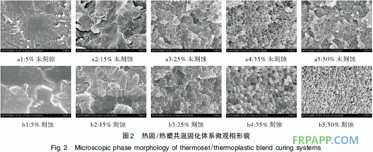 其中前者多形成雙連續結構,而后者往往形成海( 富熱固相) /島( 富熱塑相) 結構。然而,由于相分離發生受到化學結構、分子質量、固化溫度等眾多外在因素影響,Spinodal 分相機理與Nuclear -growth 機理也可能在一次反應中同時出現,因而相分離形貌有時還可能表現為兼具上述雙連續與海島兩種微觀特征而更加復雜的微觀結構形式[7]。