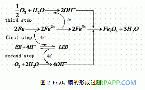 與暫時起屏蔽作用的傳統涂料相比,聚苯胺可以使金屬基材發生鈍化,在不同金屬表面形成一層致密、穩定的氧化膜(如Fe2O3, Al2O3 等),使金屬的電化學腐蝕電位發生正位移動,并使得該金屬電極電位處于鈍化區而得到保護,Fe2O3膜的形成過程如圖2 所示[14]: