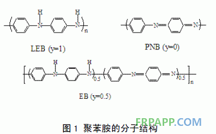 聚苯胺是由還原單元和氧化單元兩部分組成的,并且根據它的氧化還原程度(0 ≤ y ≤ 1), 可以為全還原態(y=1, 簡稱LEB), 全氧化態(y=0, 簡稱PNB),及中間氧化態(y=0.5,簡稱EB)。MacDiarmid 等最早給出了聚苯胺的分子結構(見圖1),其中只有中間氧化態聚苯胺可以通過質子酸的摻雜由絕緣體變為導體。