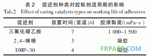 膠粘劑的適用期是使用過程中檢查膠液質量的重要工藝指標之一。適用期是指膠粘劑從各組分混合開始至能維持其可用時間的時間段。膠粘劑固化速率越快時,其適用期越短;反之,膠粘劑固化速率過慢(適用期過長)時,其儲存雖方便,但不利于實際生產操作。在其他條件保持不變的前提下, 促進劑種類對EP 膠粘劑適用期的影響如表2 所示。