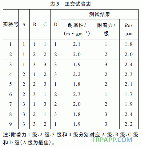 經實驗確定了酚醛環氧涂料各物質的最佳比例。m( 酚醛環氧樹脂) ∶ m( 二甲苯) ∶ m( 1,4-丁二醇二縮水甘油醚) ∶ m( 脂環改性胺) ∶ m( 聚醚胺) 為100∶ 20∶ 20∶ 25∶ 10。為了制備性能優越的酚醛環氧涂料,還必須添加顏填料和助劑等物質。影響涂層附著力、耐磨性和粗糙度等性能的主要因素是石英粉、云母粉、滑石粉和鈦白粉等顏填料,因此為了提高酚醛環氧涂層附著力和耐磨性,降低涂層粗糙度,在保持成膜物、助劑和固化劑等組分不變的情況下,采用四因素三水平的正交試驗,研究石英粉、云母粉、滑石粉和鈦白粉等對酚醛環氧涂層附著力、耐磨性和粗糙度的影響,并進行極差分析篩選涂料最佳配方組成。
