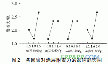 由圖2 可知,隨著云母粉和滑石粉質量的增加,涂層附著力不再增加。云母粉具有附著強的特性,但是隨著云母粉質量增加,涂料分散性降低,導致附著力有所下降。對涂層附著力分析,可以得出石英粉質量為1. 0 g,云母粉質量為0. 8 g,滑石粉質量為0. 2 g,鈦白粉質量為1. 6 g 時,涂層附著力達到最佳效果。