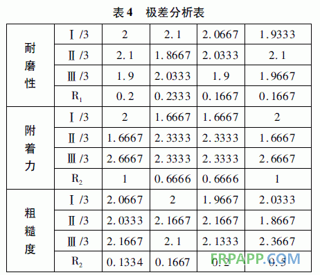 根據單因素水平實驗結果,正交試驗采用四因素三水平L9( 34 ) 正交試驗因素水平設計見表2。實驗中將酚醛環氧樹脂的質量定為10 g,考察石英粉、云母粉、滑石粉和鈦白粉質量對涂層性能的影響。試驗結果見表3,方差分析見表4。對正交試驗進行方差分析計算,即計算Ⅰ和R 值,Ⅰ代表某一水平三次組合配方的三次試驗結果之和,Ⅰ/3 為三次試驗結果之和的平均值。R 值為極差,表示某因素水平的Ⅰ、Ⅱ、Ⅲ的最大差數。