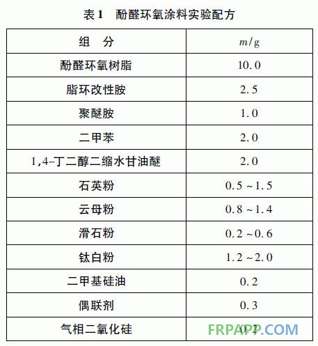 在裝有10 g 的酚醛環氧樹脂的容器中加入2 g二甲苯、2 g 1,4-丁二醇二縮水甘油醚,充分攪拌混合均勻至完全溶解,隨后依次加入石英粉、云母粉、滑石粉和鈦白粉并攪拌均勻; 在高速攪拌情況下加入其他助劑,并混合均勻,最后在攪拌下加入2. 5 g脂環改性胺和1 g 聚醚胺,混合均勻后即為酚醛環氧樹脂涂料。酚醛環氧涂料配方見表1。