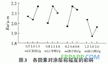 由圖1 可知,隨著石英粉和鈦白粉用量的增加,涂層耐磨性明顯增加,石英粉作為堅硬耐磨的填料具有良好的耐磨性。當m( 石英粉) 超過1 g,m( 鈦白粉) 超過1. 6 g 后,涂料分散不均勻,導致涂層耐磨性下降。采用適量的云母粉,涂層耐磨性優良。隨著滑石粉用量增加,涂層耐磨性基本呈減小趨勢,滑石粉具有優異的減磨效果。對涂層耐磨性分析,可以得出石英粉質量為1. 0 g,云母粉質量為0. 8g,滑石粉質量為0. 2 g,鈦白粉質量為1. 6 g 時,涂層耐磨性達到最佳效果。