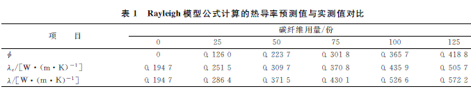從表1可以看出,當(dāng)碳纖維用量不超過125份時,預(yù)測值λc 比實測值λ 略小,其偏差不超過17%。說明Rayleigh模型公式可以較為準(zhǔn)確地預(yù)測出纖維狀填料/橡膠復(fù)合材料的熱導(dǎo)率。