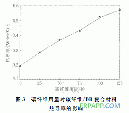(2)隨著碳纖維用量的增大,碳纖維/BR 復(fù)合材料的熱導(dǎo)率明顯增大,當(dāng)碳纖維用量為125份時,復(fù)合材料的熱導(dǎo)率比空白試樣提高193%。