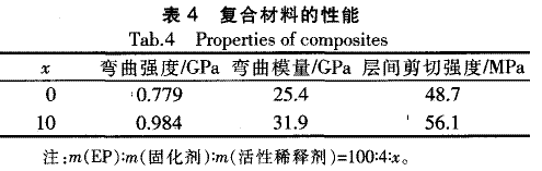 以EP/固化劑/活性稀釋劑為基體、單向玻璃纖維為增強材料,則相應復合材料在0。方向上的性能如表4所示。由表4可知:當加(活性稀釋劑)=10%(相對于EP質(zhì)量而言)時,復合材料的彎曲強度、彎曲模量和層間剪切強度分別提高了26.4%、25.6%和15.2%。