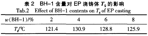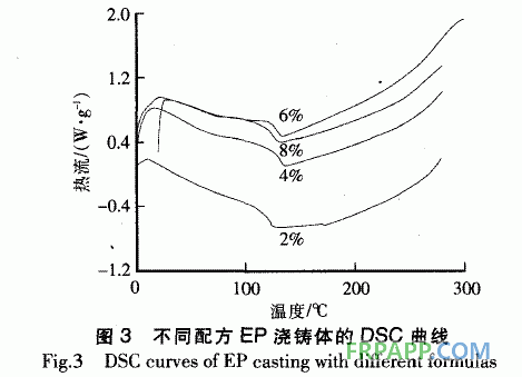 是指高分子鏈段運動剛被凍結(jié)(或被激發(fā))時的溫度。對熱固性樹脂及其復合材料結(jié)構(gòu)件而言,人們最關(guān)心的是在一定溫度下材料的強度和抗變形能力,而表征樹脂抗變形能力的最重要指標是Tg。在其他條件保持不變的前提下,EP澆鑄體的DSC曲線如圖3所示,相應的Tg列于表2。