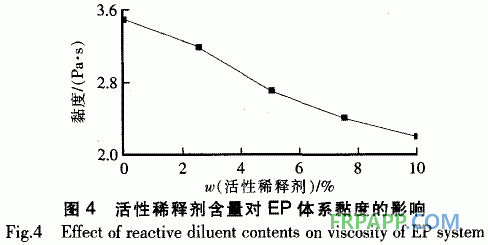 25℃時純EP的黏度為5~10 Pa·s 由圖4可知:體系黏度隨活性稀釋劑含量增加而降低,說明在EP/BH一1體系黏度相對較低的基礎(chǔ)上,通過改變活性稀釋劑的含量,可進一步調(diào)節(jié)體系的黏度,以滿足成型工藝對樹脂體系的黏度要求。