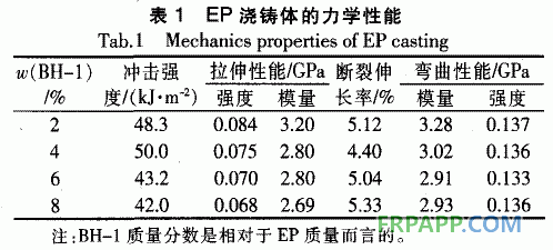 將EP在80℃時抽真空脫泡若干時間,然后加入BH一1,攪拌均勻;隨后將上述物料澆鑄到涂有脫模劑的預熱至80℃的模具中,80 ℃抽真空脫泡若干時間;最后放入烘箱中按照“80℃/2 h— l00℃/2 h”進行固化,自然冷卻后脫模,切割成標準試樣,備用。
