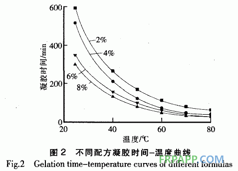 復合材料基體的選擇,是由樹脂澆鑄體的力學性能和凝膠時間來確定的。為了解EP固化體系的反應特性,分別測試了各配方在不同溫度時的凝膠時間,結(jié)果如圖2所示。
