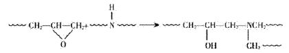 近年來,國內外相繼提出了許多脂肪胺固化劑的改性方法。利用曼尼希反應[21-22]改性的乙二胺和二乙烯三胺分子中含有酚羥基、胺類活潑氫和酚醛骨架結構,提高了固化反應速度,極易形成高度網狀交聯結構,改善了環氧樹脂本身的耐腐蝕性,因而得以廣泛應用。酚醛改性胺固化機理以下式表示: