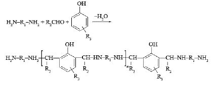 酚醛樹脂改性胺類環氧固化劑的合成是由酚類和多胺類化合物與醛經曼尼希(Mannich)反應而成的低分子聚合物,不同的酚、醛、胺可合成出性能各異的固化劑。其化學反應通式如下:
