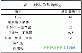 將一定量的環(huán)氧樹脂裝入三口燒瓶中,先加入一定量的聚氨酯預(yù)聚體,不斷攪拌,控制反應(yīng)時間和溫度。然后按順序加入流平劑、碳酸鈣和固化劑,均勻攪拌制得改性涂料。配方見表1。