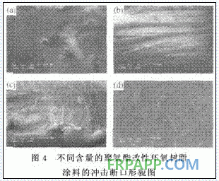 (3)未改性環(huán)氧樹脂涂料的沖擊斷面呈典型的脆性斷裂特征,而聚氨酯/環(huán)氧樹脂的沖擊斷面呈明顯的韌性斷裂特征,表明改性的EP涂料韌性得到提高。