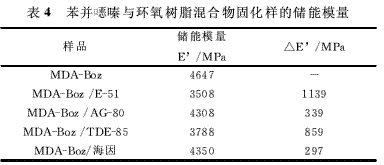 固化樣品在室溫條件下的儲能模量可以衡量材料剪切變形下的剛性,表4為苯并噁嗪與環氧樹脂混合物固化樣的儲能模量。從表4可知,苯并噁嗪與環氧樹脂共聚物的儲能模量較聚苯并噁嗪的儲能模量有所下降。這是因為苯并噁嗪開環聚合生成的酚羥基與Mannich橋的N原子之間可以形成分子內和分子間氫鍵,從而賦予聚苯并噁嗪的高模量特征。但加入環氧樹脂后,酚羥基與環氧基發生反應,導致氫鍵作用、尤其是螯合氫鍵的數量大幅下降,使得共混物剛性減小、室溫下儲能模量降低。