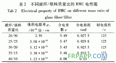 在BMC工藝中,滑石粉和玻璃纖維本身是絕緣體,具有較好的電絕緣性。但是在BMC制備過(guò)程中,由于樹(shù)脂的浸潤(rùn)性不好以及纖維與樹(shù)脂粘接性不好等問(wèn)題存在,研究不同玻纖/填料質(zhì)量比對(duì)電性能的影響很有必要。
