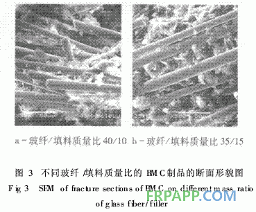 圖3是用掃描電鏡觀察到的BMC制品的斷面形貌圖。由圖可知,玻纖/填料質(zhì)量比為40/10的制品,纖維與樹(shù)脂分離嚴(yán)重,有樹(shù)脂堆積,纖維含量集中,當(dāng)玻纖不能達(dá)到理想分散時(shí),在材料內(nèi)部易產(chǎn)生缺乏玻纖的區(qū)域,成為應(yīng)力集中點(diǎn),使得BMC的力學(xué)性能降低。而玻纖/填料質(zhì)量比為35/15的BMC制品中纖維分布均勻,含量高,與樹(shù)脂粘接良好,制品缺陷少,力學(xué)性能和電性能都很理想。