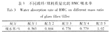 吸水率是反映材料性能的一個(gè)重要指標(biāo)。通過(guò)吸水率可以得出環(huán)氧BMC板材內(nèi)部的密實(shí)程度,氣孔的多少,以此來(lái)判定板材的性能[15]。通過(guò)測(cè)試不同玻纖/填料質(zhì)量比的BMC制品的吸水率,可以得出耐水性好,缺陷少的最佳配方。