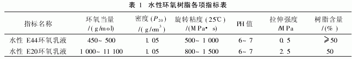 把環(huán)氧樹脂E-44的乙二醇單乙醚溶液和水 性乳化劑按一定比例攪拌混合均勻,然后加入蒸 餾水直到體系的粘度下降,此時的環(huán)氧樹脂溶液 將轉變?yōu)樗?發(fā)生了相反轉,再加入適量蒸餾水 稀釋至一定濃度即制得水性環(huán)氧樹脂。表1是水 性環(huán)氧樹脂的各項指標。
