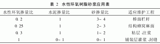 在橋梁維修加固中,新舊混凝土的粘結和裂 縫的處理,都必須使用環(huán)氧樹脂漿液。把環(huán)氧樹 脂水性化后,環(huán)氧樹脂既能隨水滲透進結構層內(nèi) 形成粘結力,又能在潮濕的結構層表面粘附與新 的水泥混凝土粘結,形成一個粘結連續(xù)體。純的 水性環(huán)氧液還可以對橋面鋪裝層裂縫進行封縫處 理,凡是水能到達的地方,環(huán)氧樹脂都能到達,這 就起到很好的堵水和加固的作用。因此,水性環(huán) 氧水泥漿液應用廣泛,表3為水性環(huán)氧水泥漿的 部分特性。