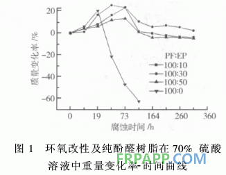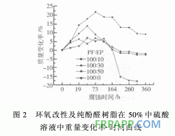 圖1為環(huán)氧改性及純酚醛樹脂在70%硫酸溶液中質(zhì)量變 化率-腐蝕時(shí)間曲線,從圖可看出,4個(gè)試樣中純酚醛樹脂在 70%濃硫酸中耐腐蝕性能最差,一開始由于吸水溶脹質(zhì)量有 所增加,腐蝕19h后,溶脹所導(dǎo)致的質(zhì)量增加已無法彌補(bǔ)被濃 硫酸腐蝕所消耗的質(zhì)量損失,純酚醛樹脂的質(zhì)量開始急劇下 降,腐蝕結(jié)束后質(zhì)量變化率最大值和最小值之差△%高達(dá) 80%。而用環(huán)氧樹脂改性過的酚醛樹脂,其耐腐蝕性能相對(duì) 于純酚醛有明顯提高,所得重量隨時(shí)間的變化曲線較平穩(wěn),3 種改性配方的△%分別為PF∶EP=100∶10為24%左右,PF ∶EP=100∶30和PF∶EP=100∶50的試樣△%均為20% 左右。