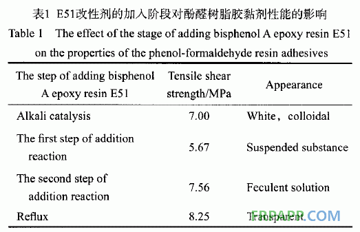 E5 l改性劑的加入階段對酚醛樹脂膠黏劑性能的影響見表1。由表1可見,在制備過程的前3個(gè)階段加入改性劑時(shí),得到的酚醛樹脂膠黏劑溶液不均勻、不透明且有膠狀物存在,說明環(huán)氧樹脂未反應(yīng)完全。這是因?yàn)樵谇?個(gè)階段,較低的反應(yīng)溫度使環(huán)氧樹脂不能完全溶解而在攪拌頭上團(tuán)聚和聚集,以致回流時(shí)不能與反應(yīng)體系充分接觸而在酚醛樹脂膠黏劑中沉淀。在回流前加入改性劑時(shí),所得酚醛樹脂膠黏劑溶液均勻且基本透明,這是因?yàn)檩^高的溫度有利于環(huán)氧樹脂的溶解,保證了它與反應(yīng)體系的充分接觸和反應(yīng)。環(huán)氧樹脂接枝到酚醛樹脂的分子鏈上,使酚醛樹脂膠黏劑的支化度提高、相對分子質(zhì)量增大。因此,以下實(shí)驗(yàn)均選擇在回流前加入E5 1改性劑對酚醛樹脂進(jìn)行改性。