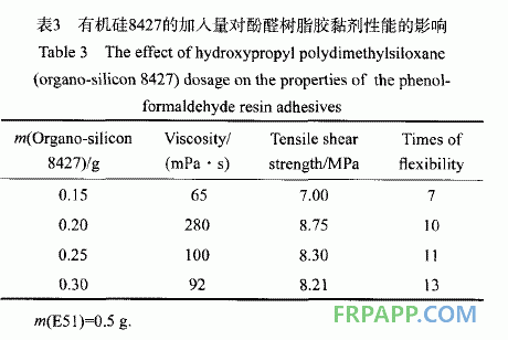 (1)在酚醛樹脂膠黏劑的制備過程中,在回流前加人約1.5%(w)(基于體系質(zhì)量)的雙酚A型環(huán)氧樹脂E51和約0.6%(W)(基于體系質(zhì)量)的有機(jī)硅8427,所得酚醛樹脂膠黏劑的黏度適中、柔韌性較好,游離甲醛含量為0.037%(W),拉伸剪切強(qiáng)度達(dá)到7.1 MPa。