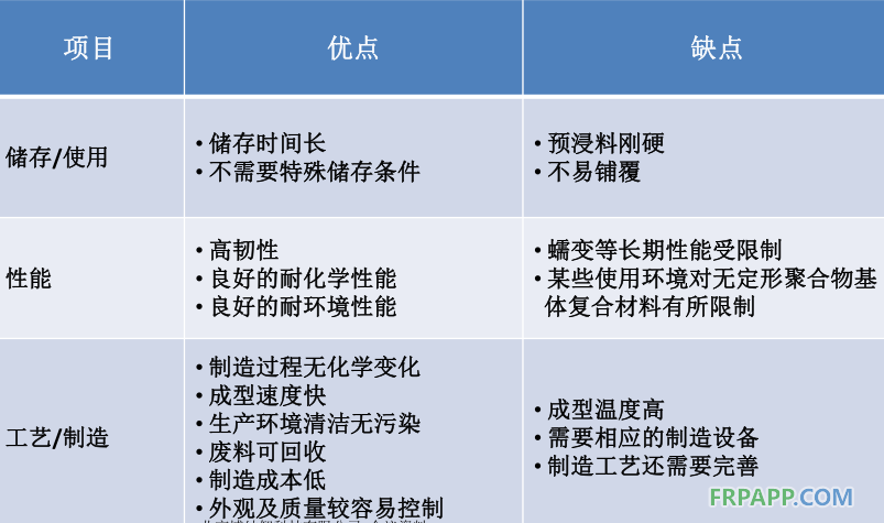 相較熱固性復合材料,熱塑性復合材料具有較高斷裂韌性,抗沖擊性,耐化學藥品及耐水性,熱成型性能好,生產率高,工藝簡單,生產周期短,環保可循環利用。