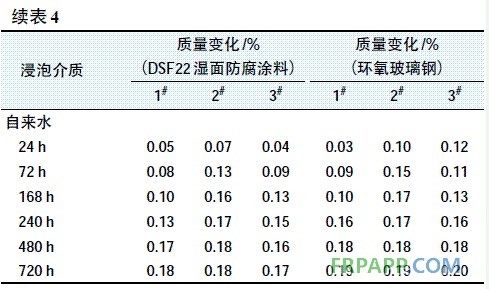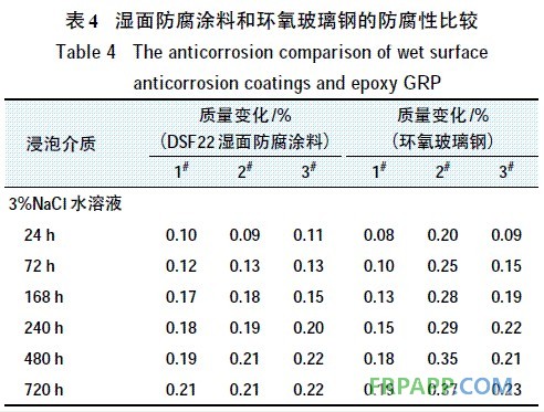 將正反兩面涂有DSF22濕面防腐涂料的碳鋼片和環氧玻璃鋼分別在3%NaCl溶液和自來水中浸泡720h,從浸泡前后樣板的質量變化來對比兩種材質樣板的防腐性(見表4),質量增加越多,防腐性越差;反之,則表示防腐蝕性越好。